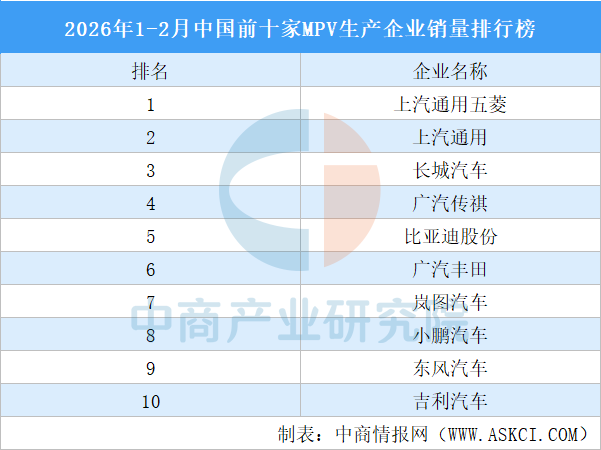 中商情報網(wǎng)訊:2026年1-2月,銷量排名前十位的MPV生產(chǎn)企業(yè)共銷售10.7萬輛,占MPV銷售總量的81.9%。上汽通用五菱銷量最高,上汽通用、長城汽車排名第二和第三,廣汽傳祺 、比亞迪股份 、廣汽豐田 、嵐圖汽車 、小鵬汽車 、東風汽車 、吉利汽車 進入前十,依次排名第4-10名。