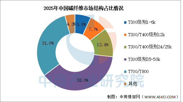 2025年,國內碳纖維產能仍以T300/T400級別為主導,占比約64.79%。更高性能的T700/T800級別碳纖維占比約30.96%。