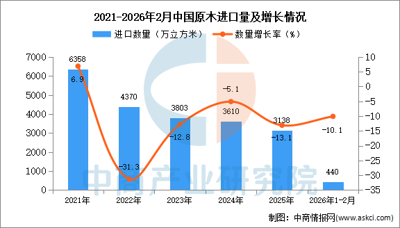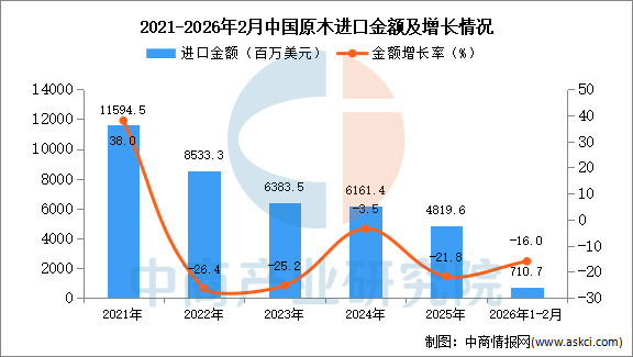 2026年2月中國(guó)原木進(jìn)口量及金額增長(zhǎng)情況