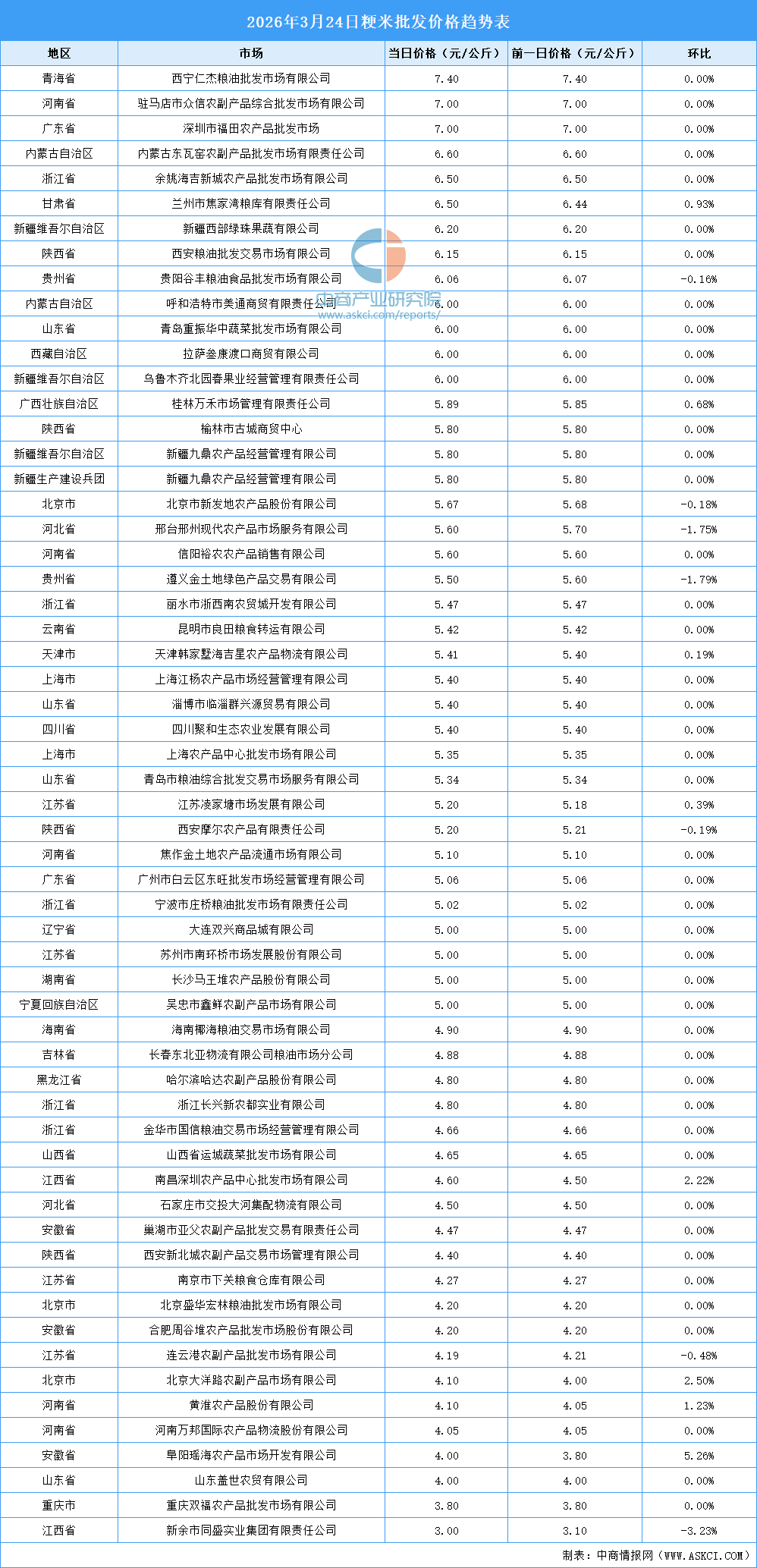 中商情報網(wǎng)訊:最新數(shù)據(jù)顯示:3月24日,全國粳米當日均價為5.23元/公斤,秈米當日均價4.81元/公斤。其中,粳米價格最高的西寧仁杰糧油批發(fā)市場有限公司,當日價格為7.40元/公斤,環(huán)比持平。秈米價格最高的市場是拉薩叁康渡口商貿(mào)有限公司,當日價格為8.00元/公斤,環(huán)比持平。以下是2026年3月24日全國大米價格趨勢表詳情:
