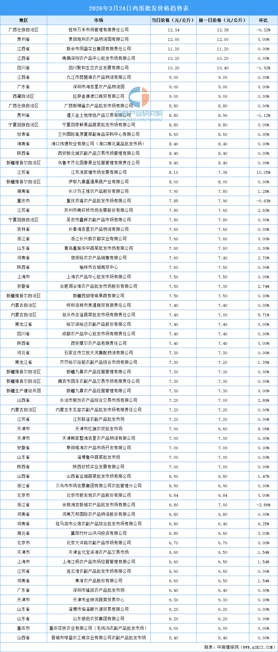 中商情報(bào)網(wǎng)訊:最新數(shù)據(jù)顯示:3月24日全國(guó)雞蛋平均價(jià)格為7.67元/公斤。其中,雞蛋價(jià)格最高的市場(chǎng)是桂林萬(wàn)禾市場(chǎng)管理有限責(zé)任公司,當(dāng)日價(jià)格為12.34元/公斤,環(huán)比下跌0.32%。雞蛋價(jià)格最低的市場(chǎng)是晉城市綠盛農(nóng)工商實(shí)業(yè)有限公司農(nóng)副產(chǎn)品批發(fā)市場(chǎng),當(dāng)日價(jià)格為5.40元/公斤,環(huán)比持平。